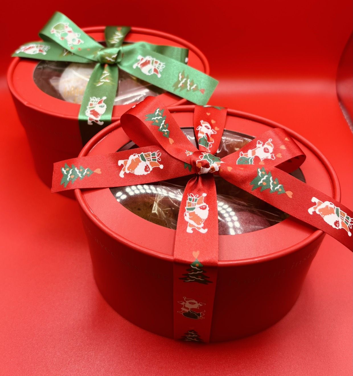 クリスマスカラーの赤いBOXに、オテルドゥスズキ人気のフィナンシェやクッキーを詰め込みました。