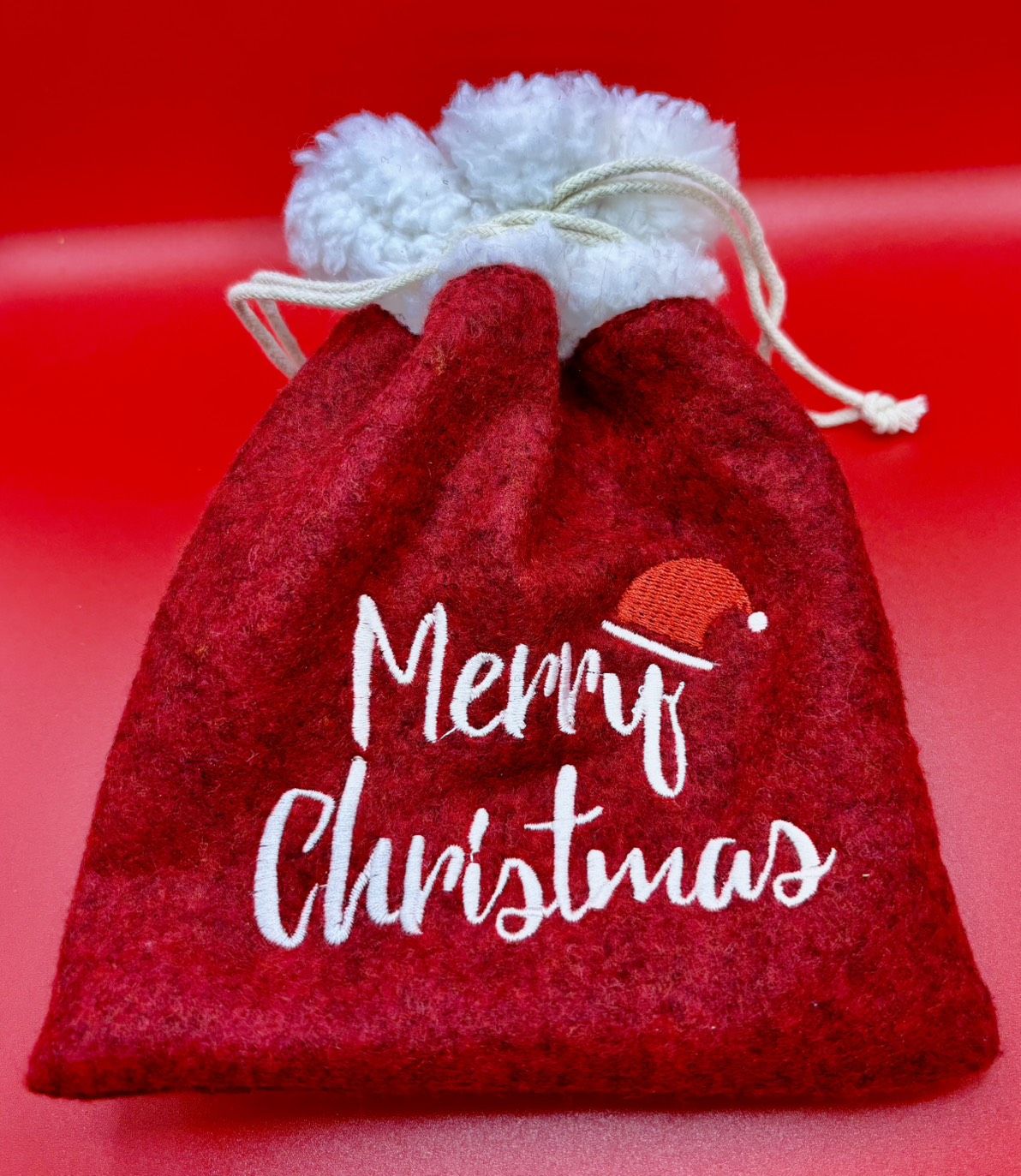 「Merry Christmas」の刺繍と、口元のもこもこボアが可愛いフェルト巾着。サンタさんの袋を思わせる温かいデザインに人気の焼き菓子を詰め合わせました。